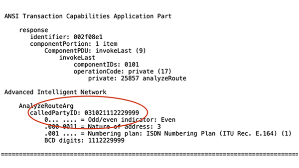 Below is shown the AIN protocol header with parameters contained within the SS7 TCAP message requesting the up-to-date destination of the ported number