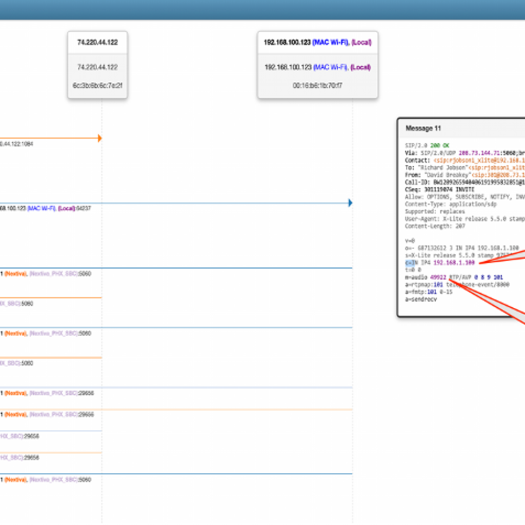 The response from the terminating software on MAC Wi-Fi in message 11 tells the other end where to route the RTP audio (route it to 192.168.100.100:UDP port 49922). The NAT protocol function operates only at the IP layer and changes the IP to the private address on the SIP Signaling packets. But to route the subsequent RTP multimedia, the NAT device needs to look inside the SIP packet which controls all aspects of the phone call including routing and features of the RTP media. Routers and firewalls do not typically do this. SIP is an application function so an ALG may be able to perform this function but often problems occur.